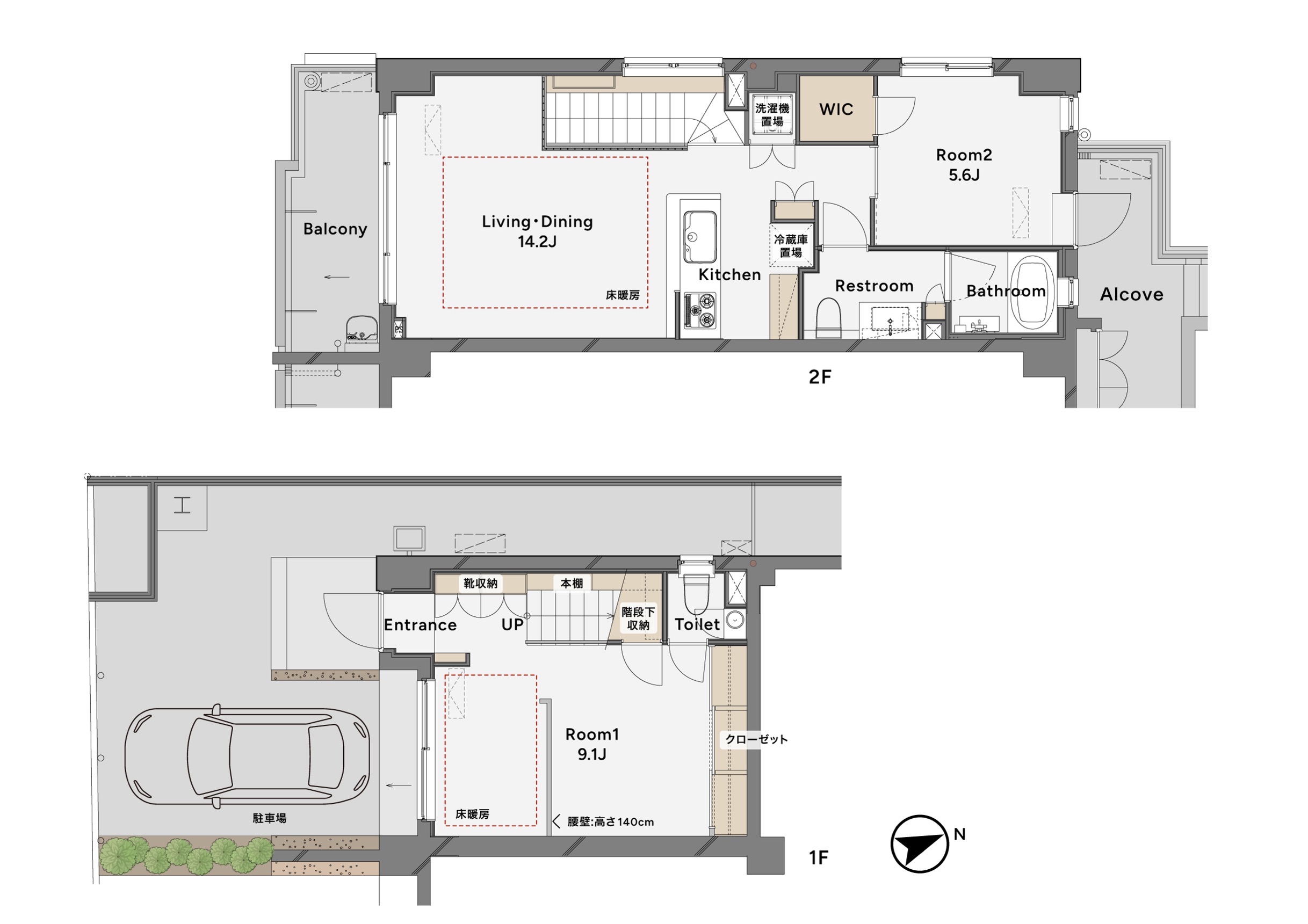 南向き角部屋2層メゾネットの住戸は、どのお部屋にいても陽当りと外の空気を感じられる戸建てのようなお部屋です。コーポラティブハウスの1部屋ですが、1-2階メゾネットを活用して専用の玄関と駐車スペース付。
